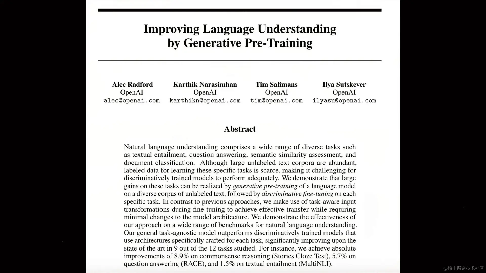 其中,GPT 的论文最早发表于 2018 年,标题为《通过生成预训练提高语言理解 Improving Language Understanding by Generative Pre-Training》,这篇论文建立在 Google 一年前推出的自注意力机制之上,并且将模型预训练作为学习文本信息的手段。GPT-2 于 2019 年发布,这是 OpenAI 最后一个完全以开源方式发布的模型,同时也公开了模型权重。