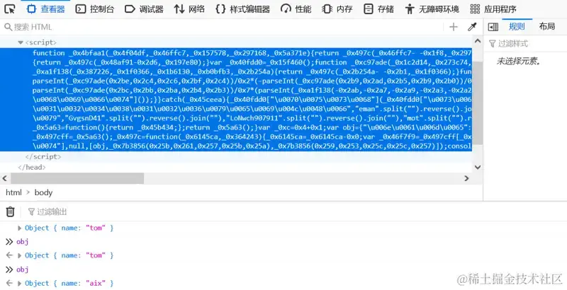 Furthermore, if the code modified using this method is then obfuscated and encrypted, it may even be impossible to locate the location of the breakpoint. As shown in the following image, encrypting the preceding code with JS-Obfuscator will result in the following form.