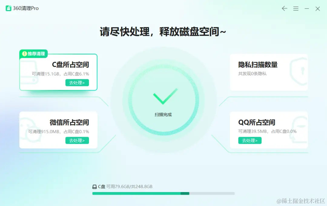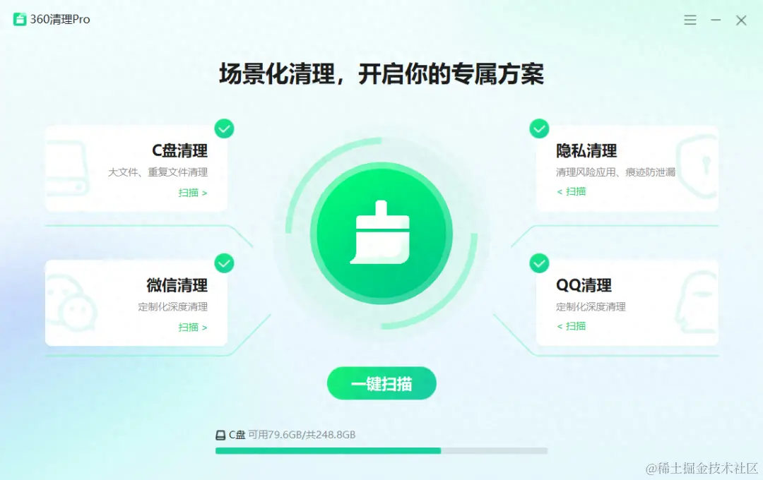 一键扫描:勾选需要清理的四大场景:C盘、隐私、微信以及QQ清理,前段清理过,现在试试全部勾选点击一键扫描