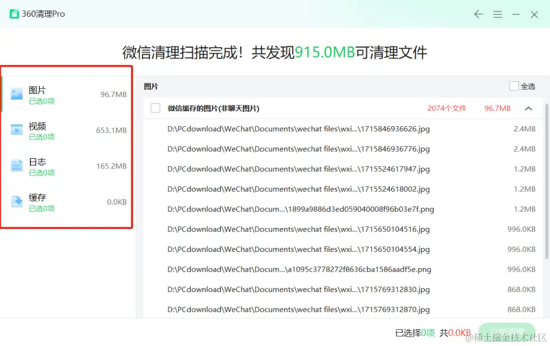 QQ清理一样,可以扫描出图片、视频、语音及额外的缓存等文件
