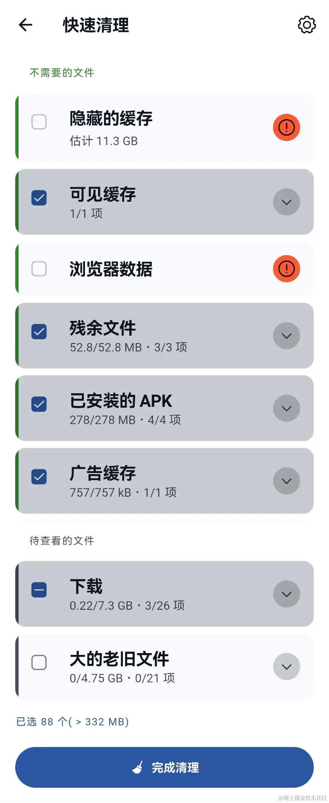 稍等片刻扫描完毕后,会发现很多额外的手机冗余数据文件,可以自主查看勾选清除