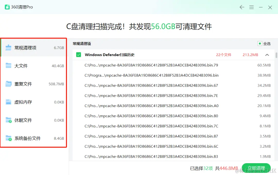 进去C盘清理查看,发现有常规清理、大文件、重复文件、休眠文件、系统备份文件等全部被扫描出来,可以选择手动勾选清除(C盘数据建议备份再清除,以防误删)