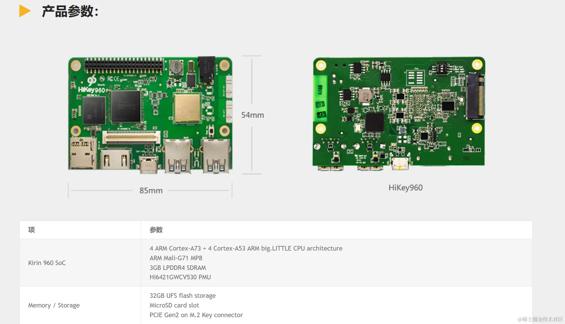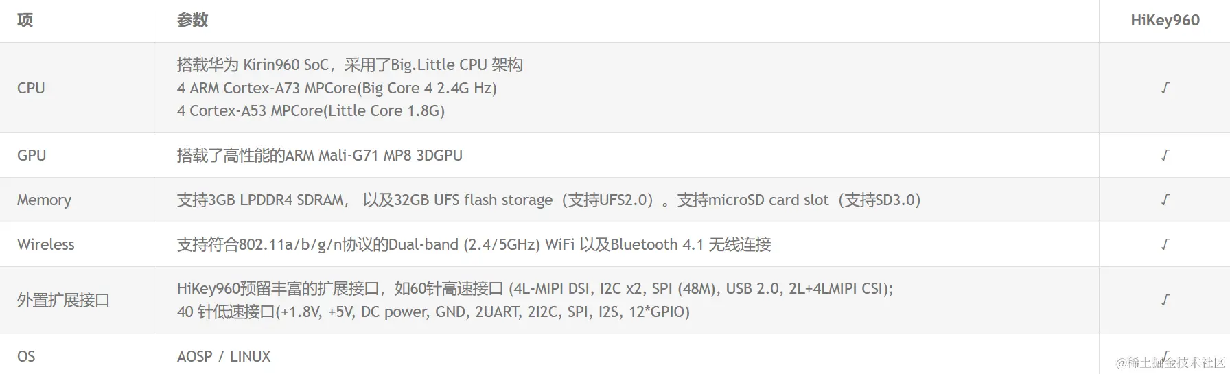 HiKey960开发板是基于华为Kirin960 SoC,其处理器采用了4 ARM® Cortex®-A73 MPCore(big Core 4 2.4G Hz) + 4 Cortex-A53 MPCore(LITTLE Core 1.8G) ARM big.LITTLE™技术,以及配以高性能的ARM Mali™-G71 MP8 3D图像处理器,同时配备了3GB LPDDR4-SDRAM内存以及32GB UFS2.0存储,支持Micro SD(SD3.0)插槽。