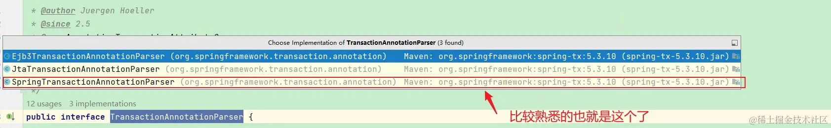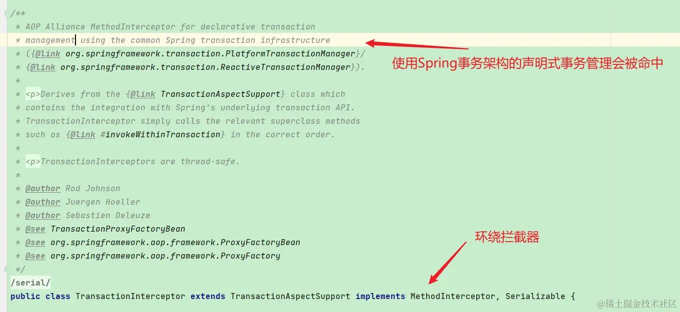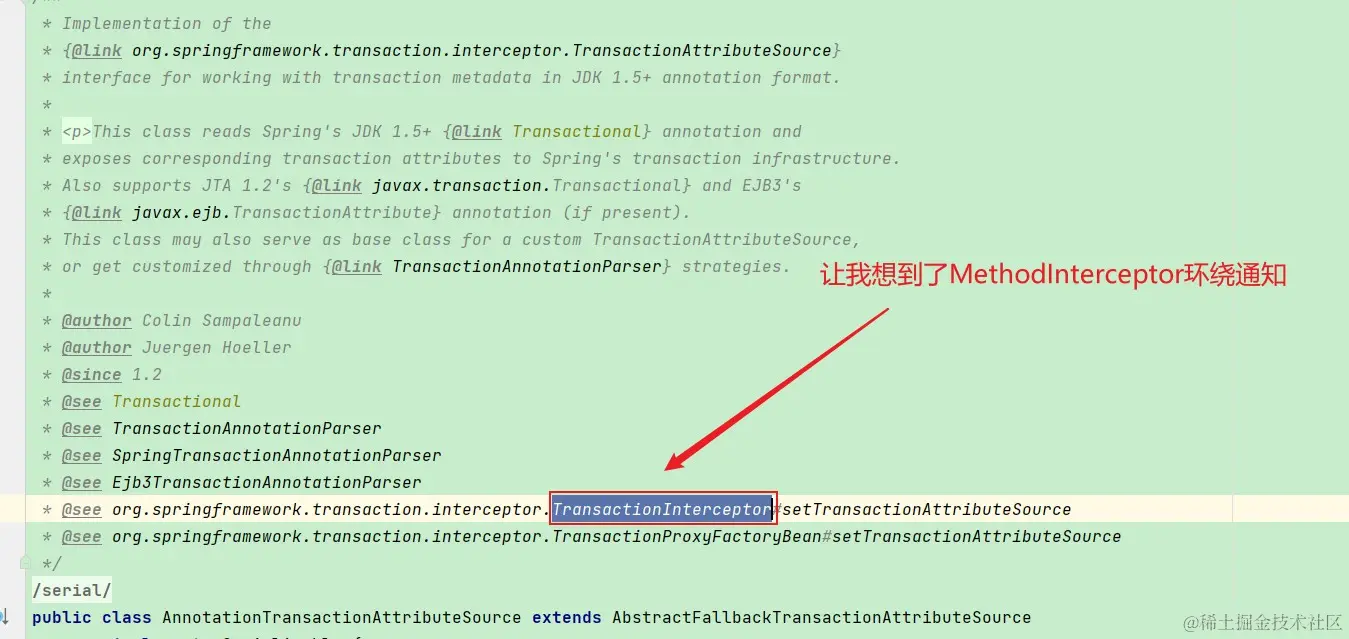 现在我们介绍第二种看源码的方法,就是猜测,有人可能会说你全靠猜啊,当然不是全靠猜,我还有验证,科学探索的一个方法就是大胆猜想,小心求证。想起来之前在B站看的课程,当时有个老师再讲某个拦截器,in是方法执行之前,out是执行之后拦截,并且作出论断,有in就有out,我将这个结论记录了下来,在之后工作中,有一次同事说需要对webservice做拦截,只找到了in的拦截器,那返回出去的该怎么办,我说有in就会有out,后面果然找到了out。这也是工程经验,也是推测。我们总是在观察然后思考找出规律,那么如果你没有我上面的思考过程,那么另一种方式也可以找到MethodInterptor,这是推测不见得准,只是一种方法,基于我们对AOP的理解,我们推测@Transactional本质上是使用AOP的环绕通知来做的,这是我们已知的,环绕通知的接口是MethodInterceptor,记单词Inerceptor, 在@Transactional的注解里面我们看到: