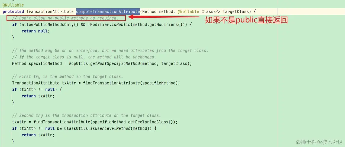 简单的看了源码,在源码中我们也只是看到了AbstractFallbackTransactionAttributeSource中的computeTransactionAttribute这个方法: