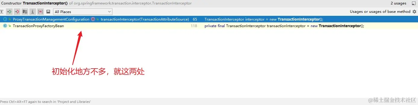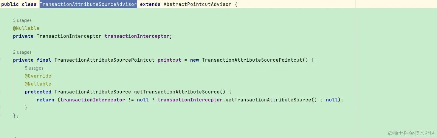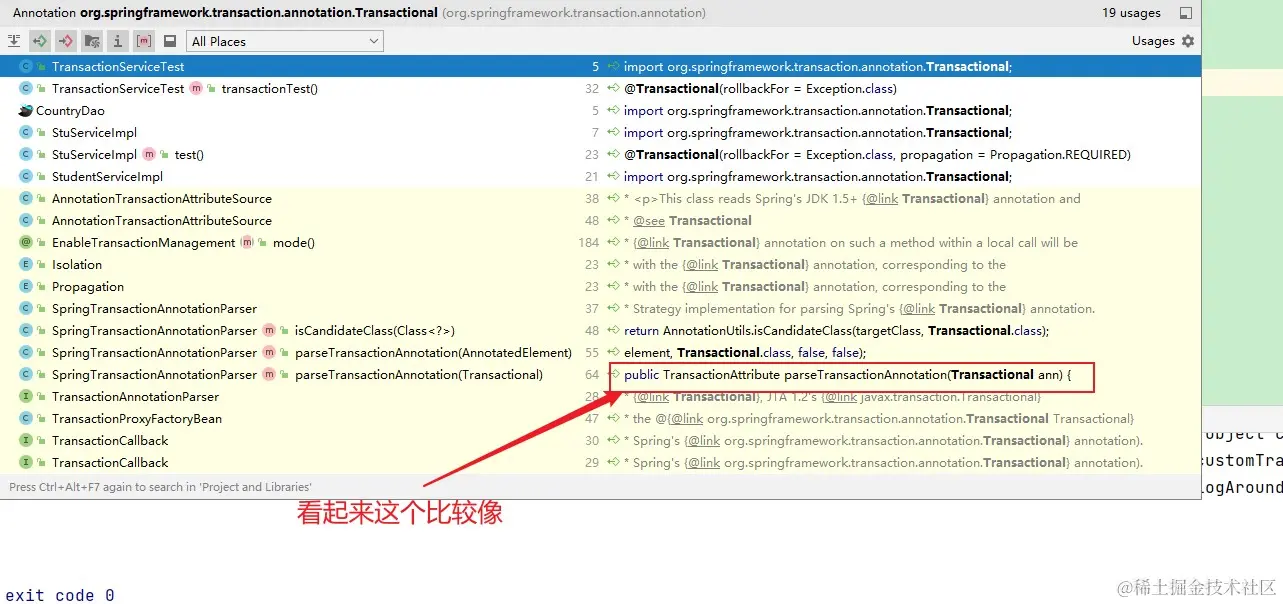 我的理解是如果子类的方法需要让事务支持,需要自己重新加上@Transactional注解。有了大致了解之后,我们接着看@Transactional是如何起作用的,我们目前已知的是我们猜测打上@Transactional注解的方法被aop命中,被代理,那么我们现在的目标就是要寻找切面、切点。对此我主要有三个思路。 一是find usage、二是推测,三是打断点。