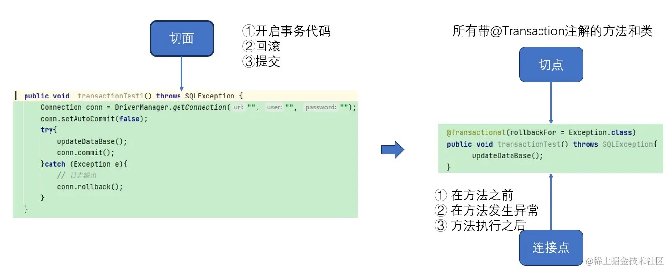 这也就是连接点,那我们帮助目标方法编写的代码也需要一个概念描述,这也就是切面。也就是说在实际开发中有些代码是重复代码,这些代码有些是在代码执行之前,有些是执行之后,我们就可以将这些代码抽出来,用切面描述。同时我们需要知道切面是哪些方法的切面,这也就是切点,有了切点之后,我们还需要知道切面在切点执行的什么时机执行,这也就是连接点。