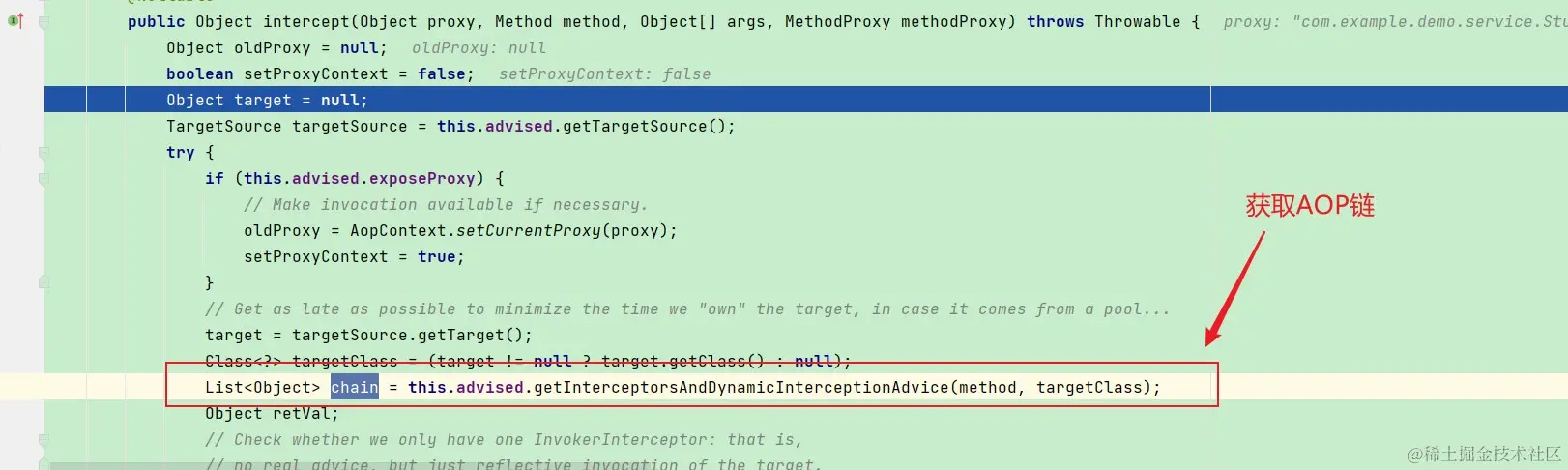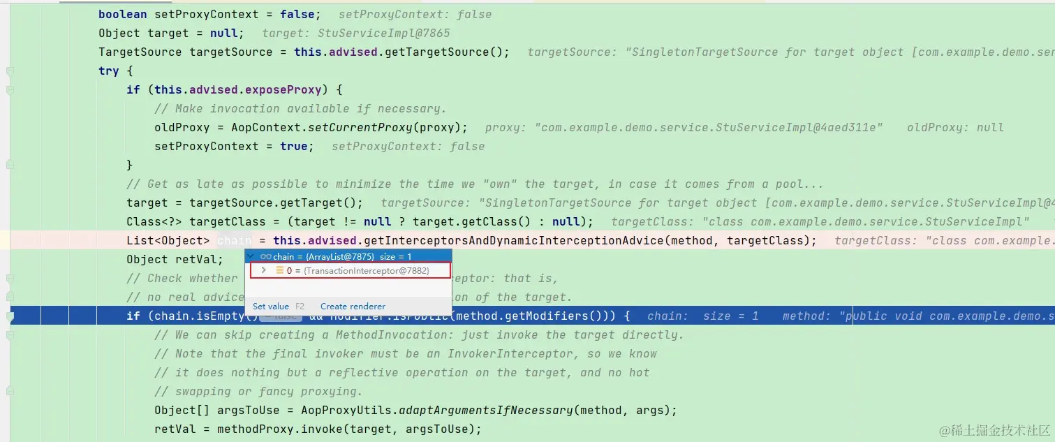 所以这里也对我们上面的思想进行修正,不是每一个方法执行的时候都会进入AOP链,还是从进入这个类的第一个方法开始去获取AOP链条。其实到这里我们就可以引出事务失效的第一个场景了,一个非事务方法调用事务方法: