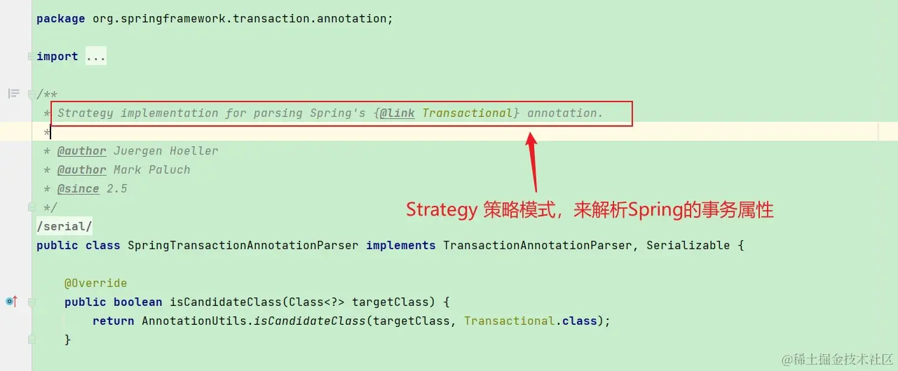 也就是说我们在看代码的时候要分清楚主次,带着问题去研究,明确自己要研究什么问题,略去次要因素,突出其主要因素,这样才方便我们得出结论。那我们这次看源码的目的就在于明确事务是在哪些场景会失效,首先我们已经基本知道了@Transactional是如何生效的,现在让我们来验证我们的想法,首先我们打开@Transactional的源码, 在注释我看到@Transactional是这样介绍自己的: