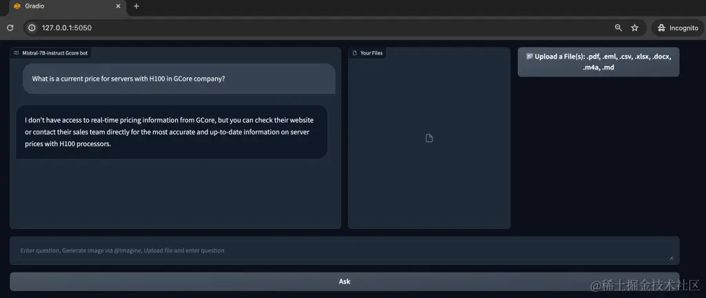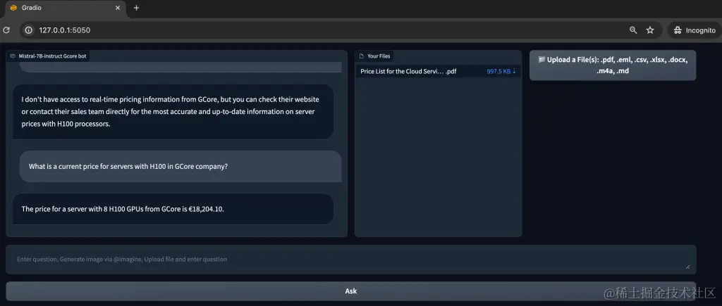 在将定价页面保存为 PDF 文件并将其用作 RAG 的额外内容后,该模型有效地解析并利用了该文件,准确地回答了有关最新定价的问题。这展示了 RAG 通过集成动态外部信息来增强聊天机器人性能的能力。