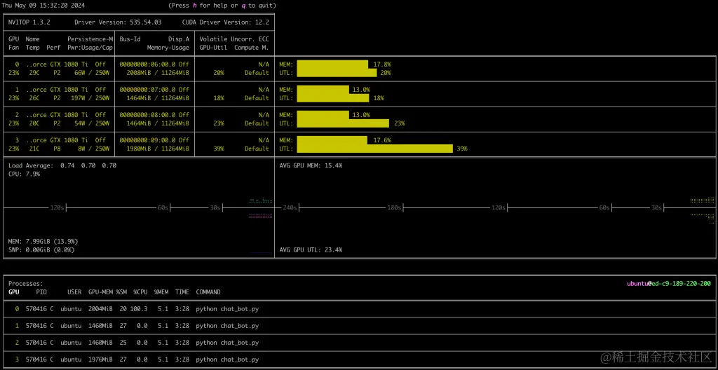 为了确保我们的聊天机器人系统的最佳性能,我在配备 4x GeForce GTX 1080 Ti GPU 的虚拟机上测试了该设置。这些资源的平均利用率对于维持聊天机器人的高要求进程至关重要。