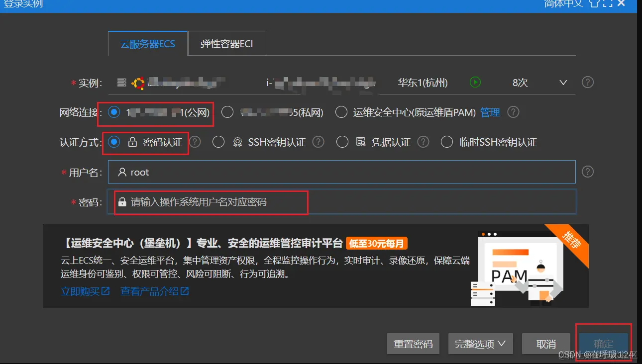 选择公网连接,密码认证,输入用户名,用户名一般是root,然后输入密码,这个密码需要自己手动重置,点击确定