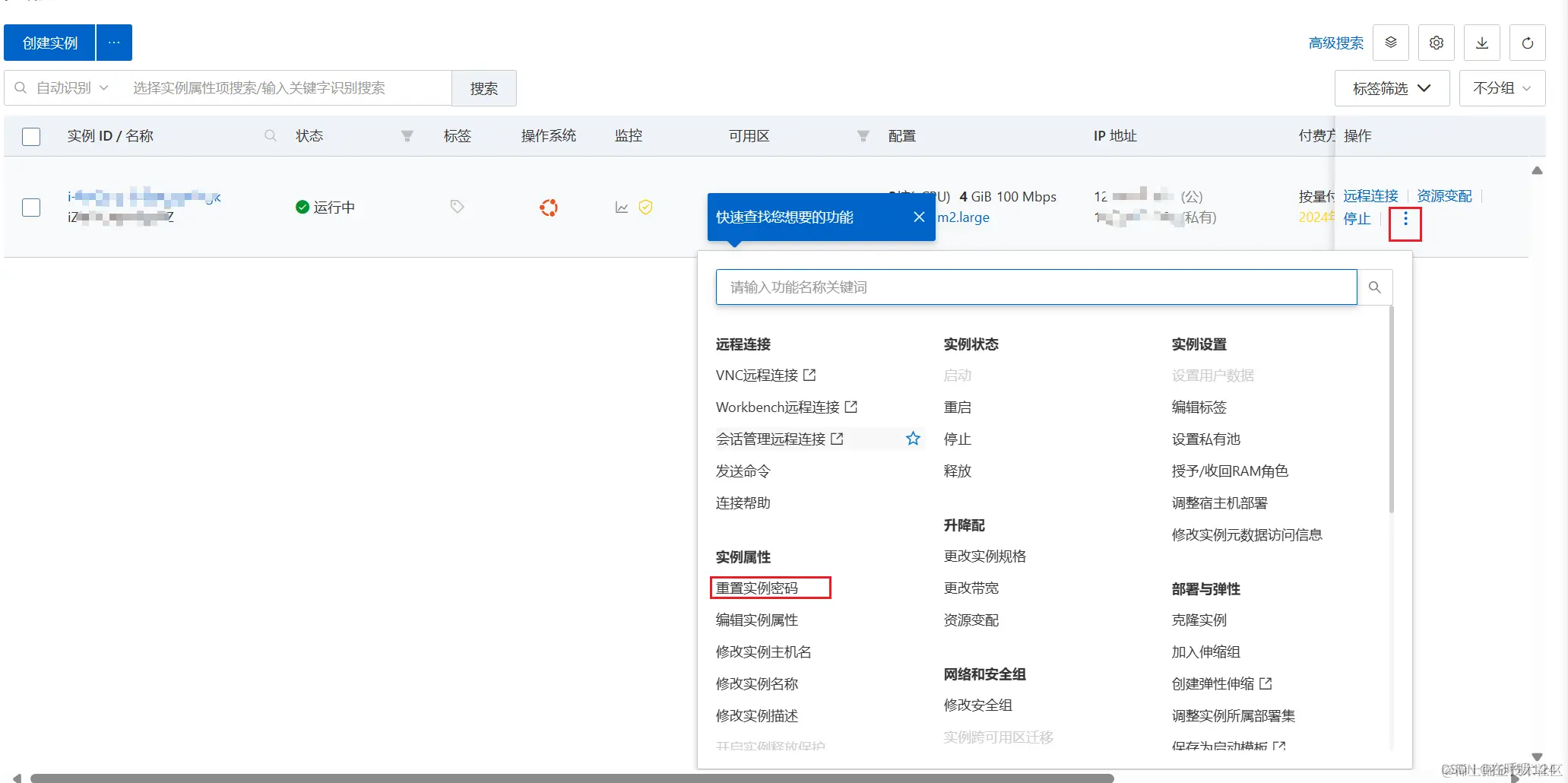 手动重置密码,返回刚刚的实例,点击三点,点击重置密码,输入你创建的密码就可以了。