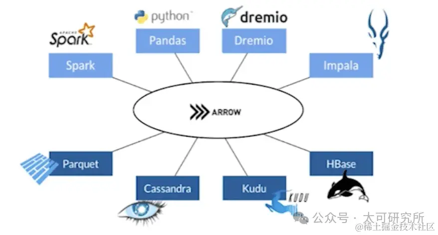 Arrow 诞生的时间其实很短,2016 年才从 Apache 基金会毕业,最初的定位是想解决跨系统的数据交换问题,如官网图所示: