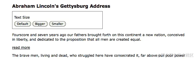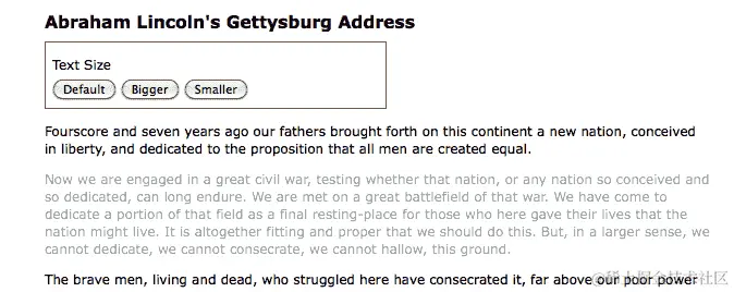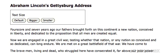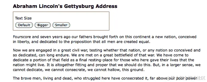 完成我们的代码后,单击“Bigger”和“Smaller”按钮将增加或减小 <div class="speech"> 的文本大小,而单击“Default”按钮将重置 <div class="speech"> 的原始文本大小。