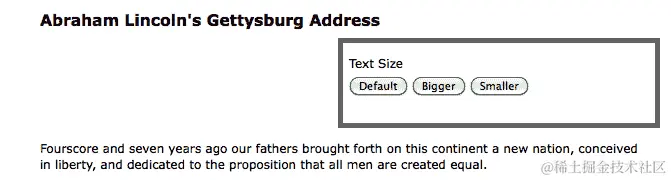 e.target.id 值用于确定点击事件的行为。sizeMap 是存储这些行为的地方。这是一个简单的对象,将元素 ID 映射到一个函数。此函数接收当前的 fontSize 值。我们之所以想使用这样的映射,是因为它比编码为 if 语句之类的东西更容易添加或删除行为。例如,假设当前的字体大小是"10px",用户点击了“放大”按钮。那么,模板字符串${sizeMape.target.id}px 将导致"14px"。