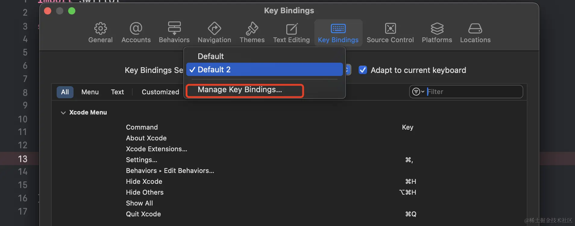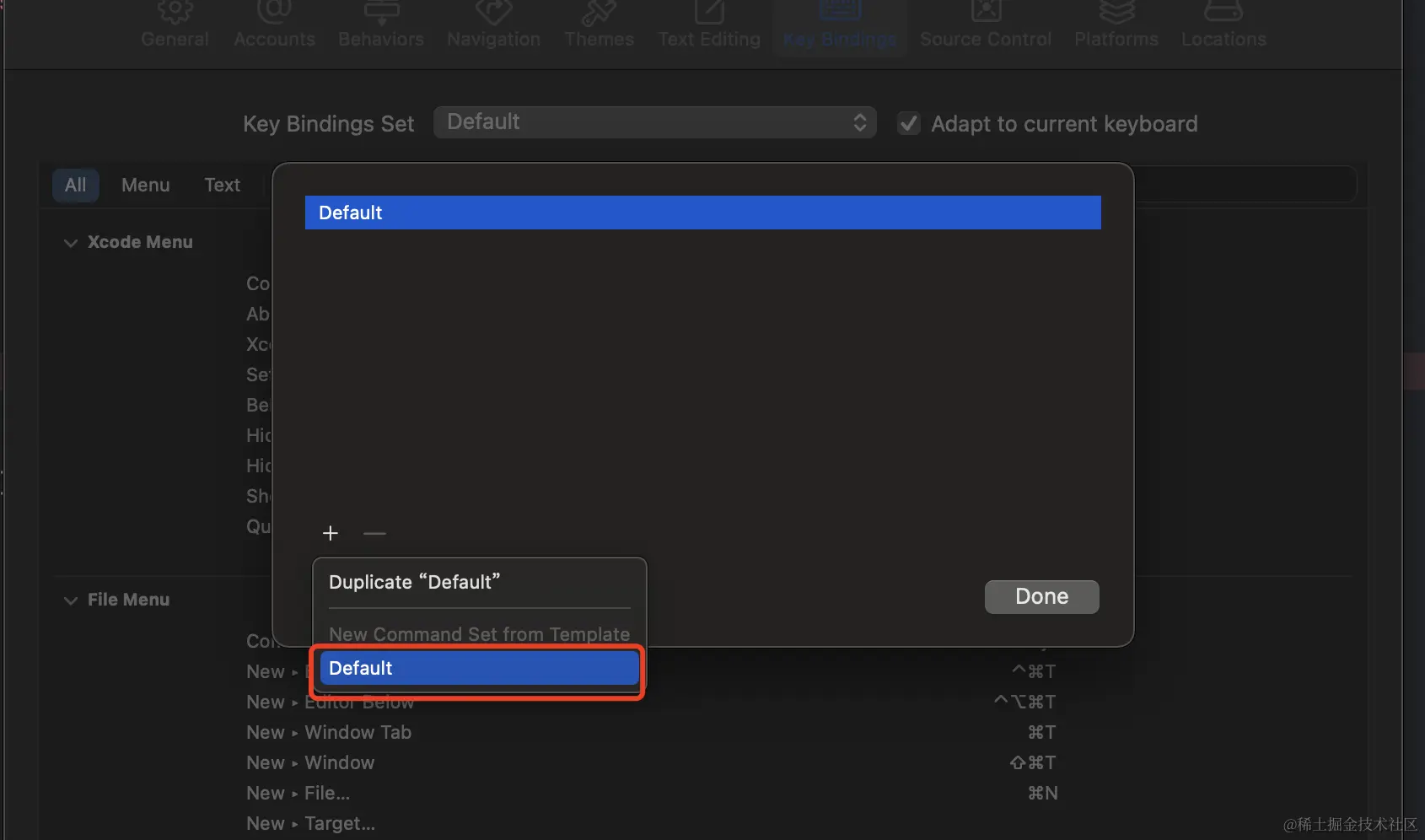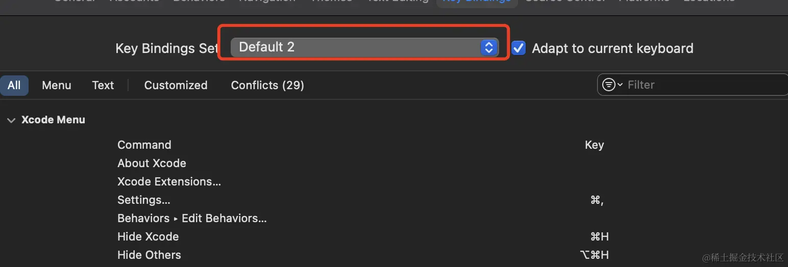 要恢复 Xcode 的默认键盘设置,可以按照以下步骤进行: