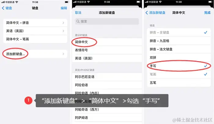(3)iphone怎么设置手写?在键盘设置页面中,点击**【添加新键盘】,选中【简体中文】**。