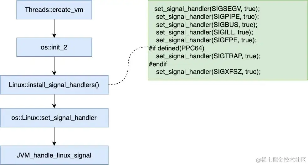 我们只要研究 Linux 下的 JVM,为了便于说明,也方便大家查阅,我把其中关于信号处理的关键流程整理了下(忽略其中的次要代码)