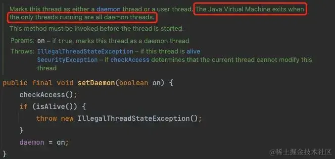 也就是说只有在 JVM 的所有线程都是守护线程(daemon thread)的时候才会完全退出,什么是守护线程?守护线程其实是为其他线程服务的线程,比如垃圾回收线程就是典型的守护线程,既然是为其他线程服务的,那么一旦其他线程都不存在了,守护线程也没有存在的意义了,于是 JVM 也就退出了,守护线程通常是 JVM 运行时帮我们创建好的,当然我们也可以自己设置,以开头的代码为例,在创建完 TestThread 后,调用 testThread.setDaemon(true) 方法即可将线程转为守护线程,然后再启动,这样在主线程退出后,JVM 就会退出了,大家可以试试