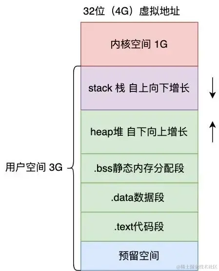 现代操作系统为了保护进程之间不受影响,所以使用了虚拟地址空间来隔离进程,进程的寻址都是针对虚拟地址,每个进程的虚拟空间都是一样的,而线程会共用进程的地址空间,以 32 位虚拟空间,进程的虚拟空间分布如下