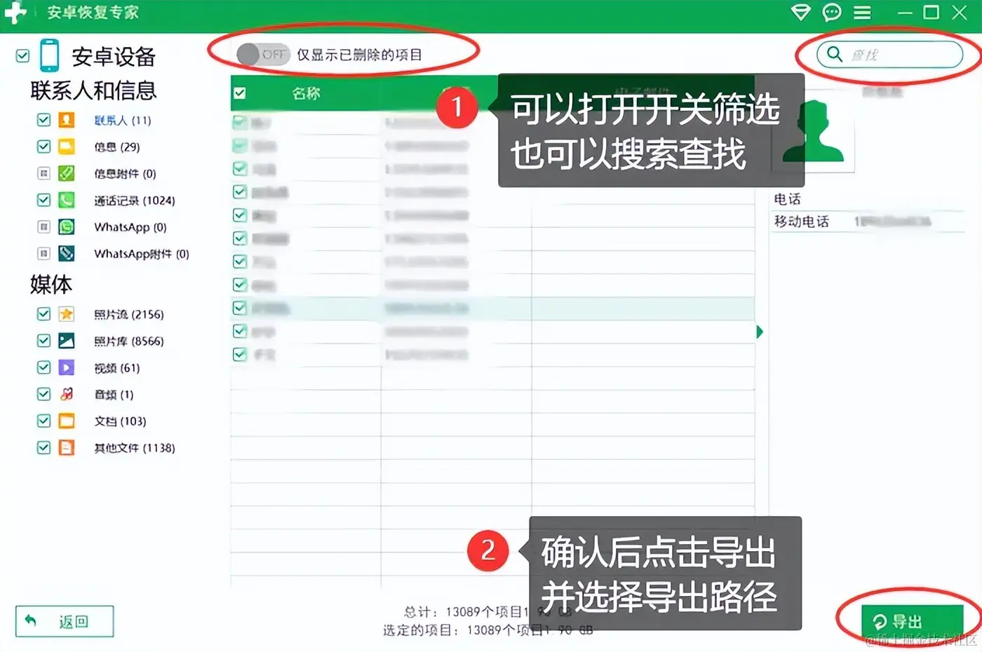 步骤3:扫描完成后,软件将列出扫描结果。在此列表中,查找你需要的联系人信息。可以勾选多个联系人,并点击 【导出】 按钮,将它们恢复到手机或电脑中。