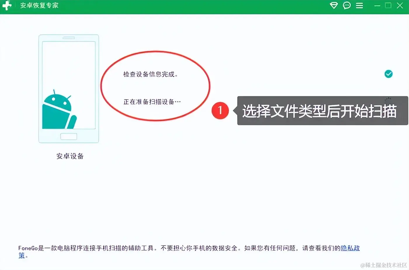 步骤2:连接完成之后回到电脑上操作,并选择文件类型,然后进入下一步,软件将对手机进行深度扫描,查找已删除或丢失的通讯录数据。