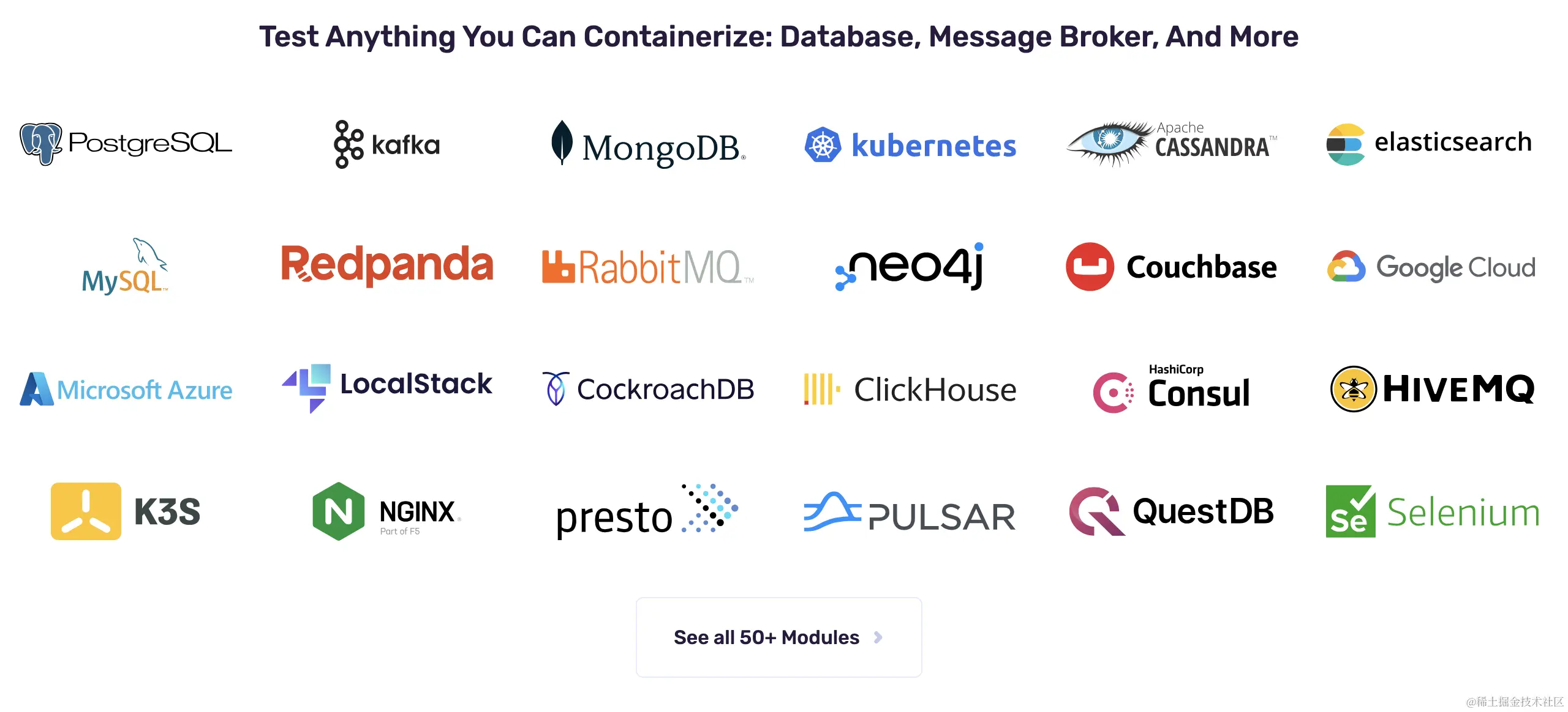 Testcontainers 是一个用于创建临时 Docker 容器进行单元测试的 Java 库。当我们想要避免使用实际服务器进行测试时,它非常有用。,官网介绍称支持50多种组件。
