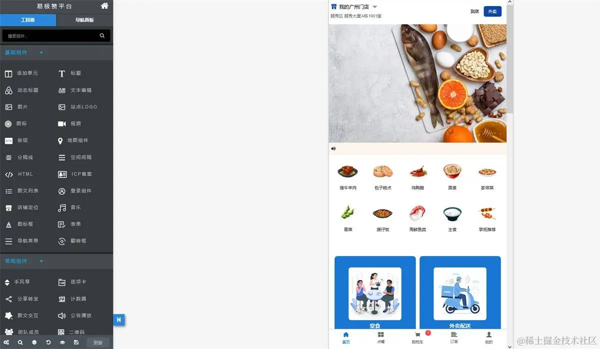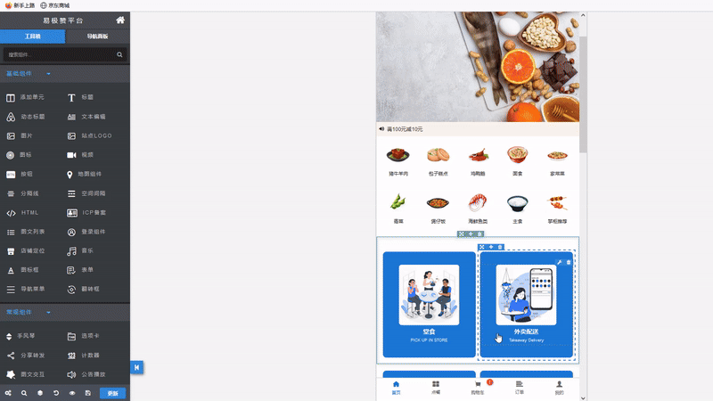 step3, 在线编辑修改站点内容,设计完成后,点击发布这样一个餐饮外卖小程序就制作完成了