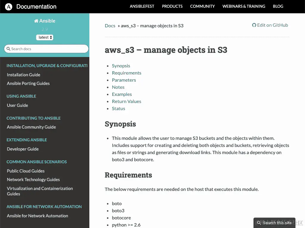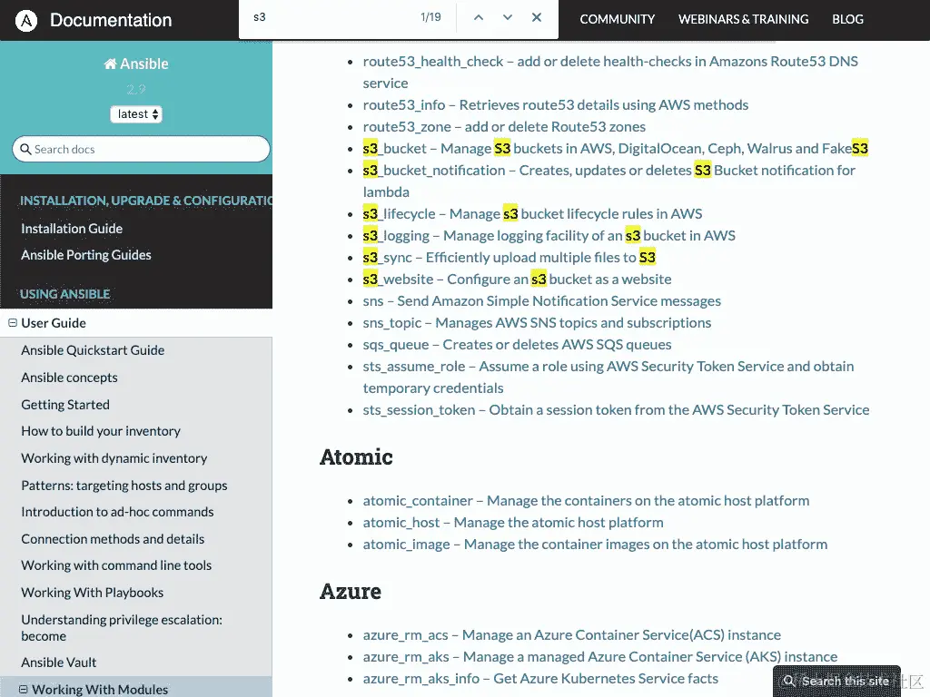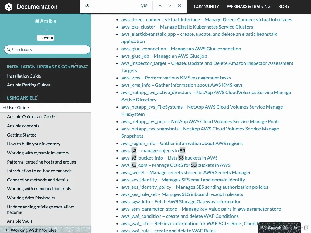 假设你想要查看是否有一个原生的 Ansible 模块可以帮助你配置和管理你的亚马逊网络服务 S3 存储桶。这是一个相当明确、明确定义的需求,所以让我们以一种逻辑的方式来处理: