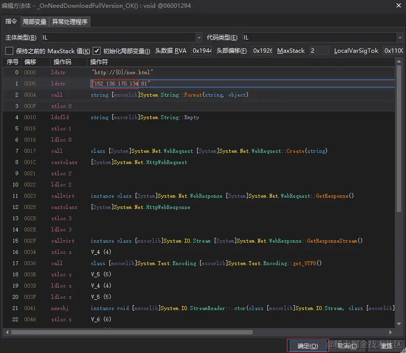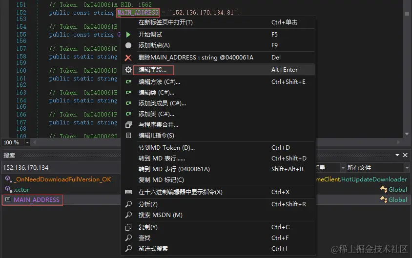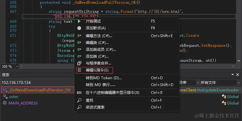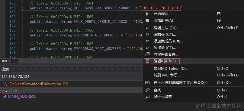 双击第一个搜索结果xxxx_OK,跳转到对应文件后,先点击代码中的152.136.170.134,再鼠标右键,选择编辑IL指令。