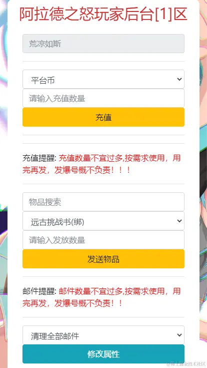 玩家 GM 后台链接:http://ip:81/gmht,授权后就可以登录使用,同样可以充值和发送物品,清理背包等。