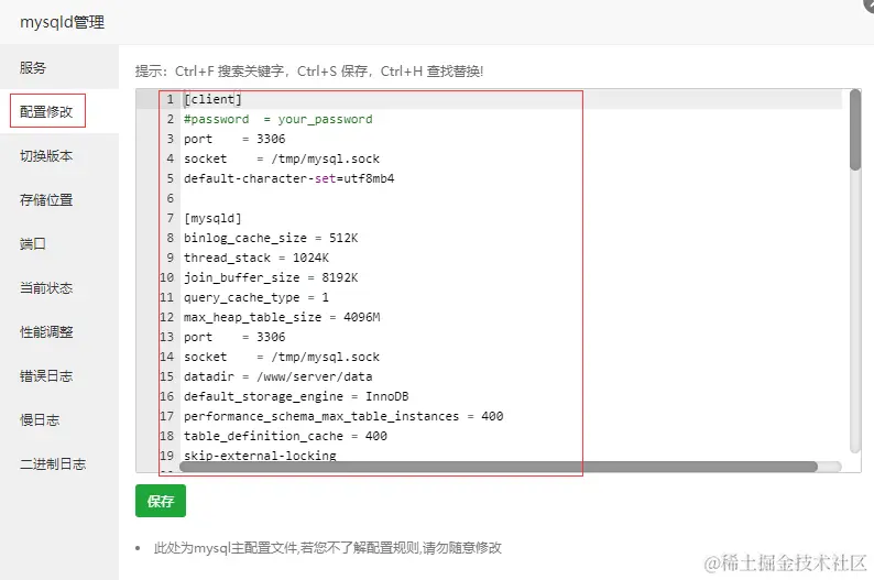 在软件商店中设置 Mysql,配置修改为分享资源中 数据库配置.txt 中的内容,全部替换然后保存。