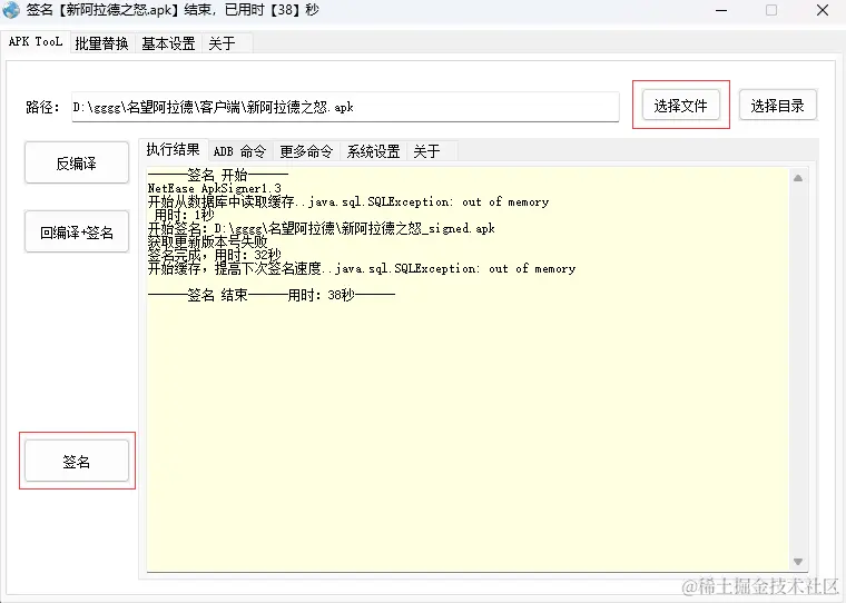 安卓客户端改好后,需要重新签名。使用提供的 ApkTool1.0.zip,它集成了 Java,无所额外安装,非常方便。选择文件后,点击签名,等待签名完成即可。
