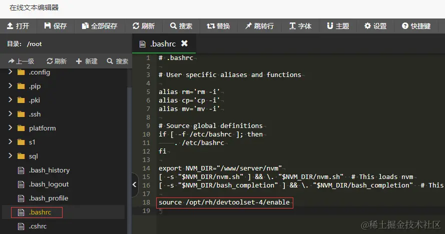 修改 /root/.bashrc 文件,最后一行添加内容: