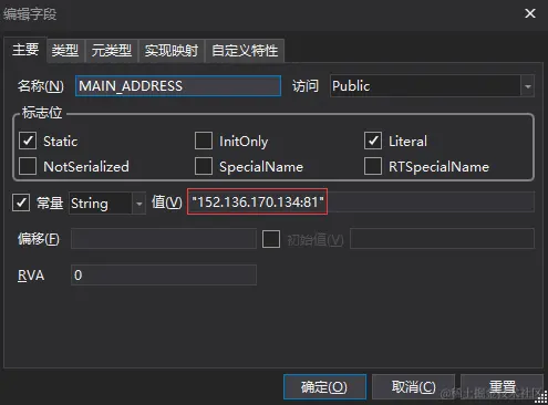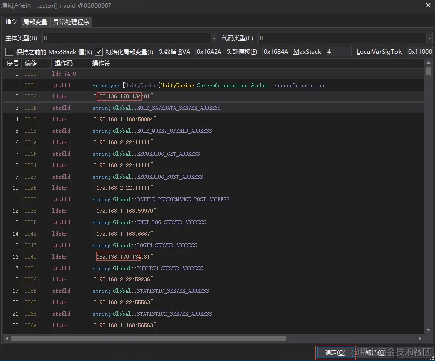 双击第二个搜索结果.cctor,跳转到对应文件后,同样先点击代码中的152.136.170.134,再鼠标右键,选择编辑IL指令。