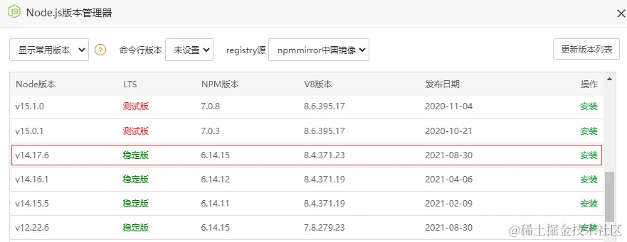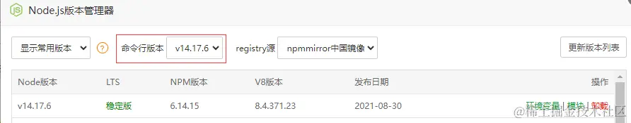 安装后,记得在上方命令行版本选择 v14.17.6 才会生效。