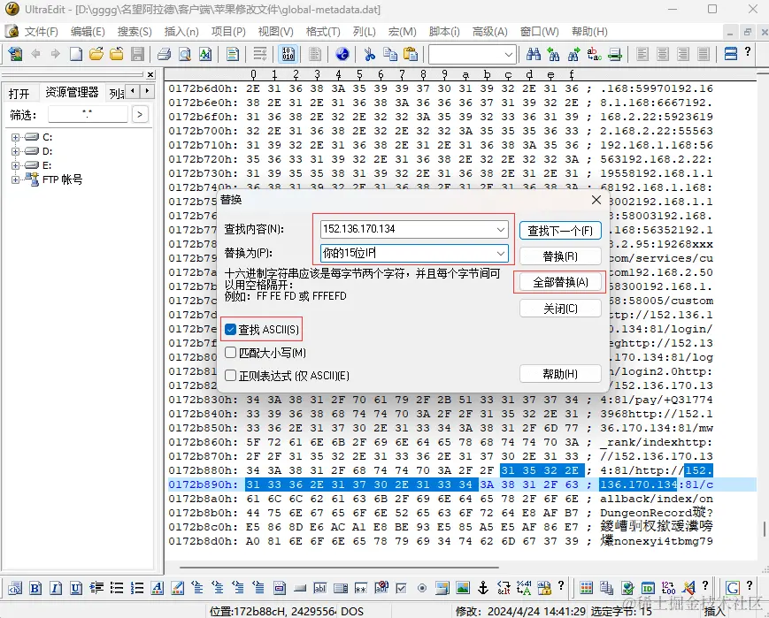 global-metadata.dat文件修改,也比较复杂,需要使用工具UE 中文版编辑器,分享资源中已提供,通过 UE 工具 打开global-metadata.dat文件后,点击工具上方的搜索 - 替换,勾选查找 ASCII,查找内容输入152.136.170.134,替换内容填写你补全的 15 位 IP,同样需要对位才可以,全部替换后保存。