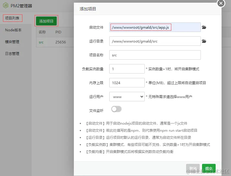 配置完 Node 环境,再打开 PM2 管理器,在项目列表中添加项目,启动文件设置为 /www/wwwroot/gmald/src/app.js,后面的表单内容会根据启动文件自动生成,点击提交即可。如果游戏总是掉线可以将这个项目的内存上限加大,不过我测试默认内存就可以,不会掉线。