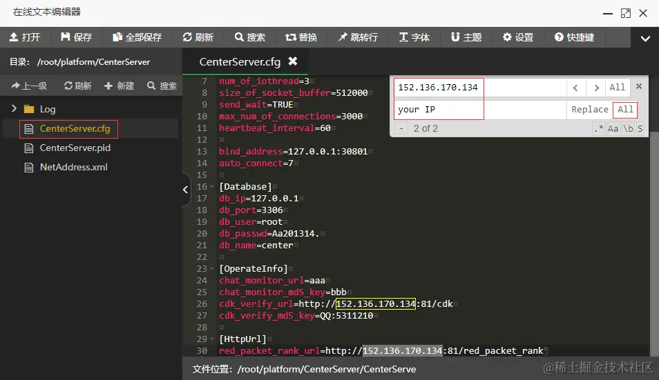 以CenterServer.cfg为例,在宝塔中找到文件,双击修改,Ctrl+F 批量替换 IP。