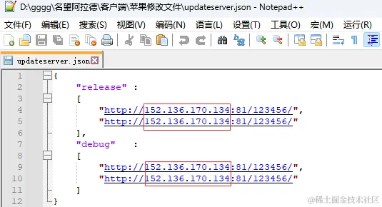 updateserver.json使用 Notepad++ 工具打开,将152.136.170.134改为你的 IP,但要注意的是,苹果端修改需要对位,保持你的 IP 为 15 位,如果你的 IP 是 13 位如 111.222.33.44 那么就需要补0,改为111.222.033.044,使每一段都数值都达到 3 位。