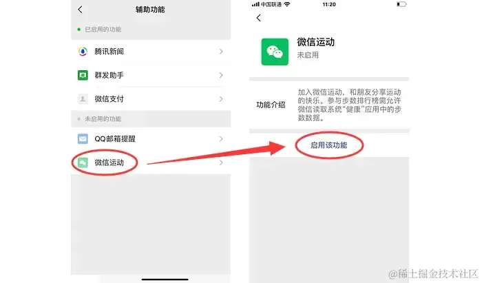 步骤4:微信步数在手机哪里看?选择**【启用该功能】按钮即可开启微信运动功能,系统将自动记录你的步数和运动情况。点击【个人头像】**,可以看到7天内的步数趋势图,以及查看之前的步数记录。