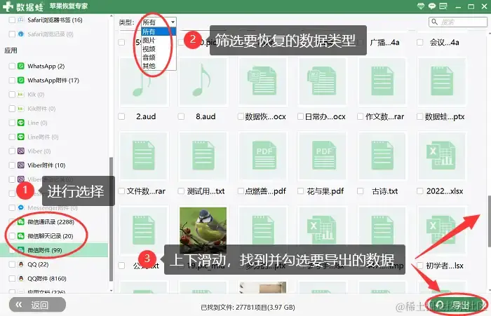 步骤3:勾选要恢复的微信数据,点击**【导出】**进行数据的保存。