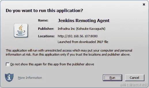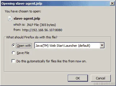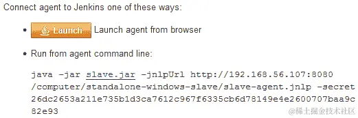 通过 Java Web Start 启动代理:这允许使用 Java Web Start 启动代理。在这种情况下,必须在代理机器上打开一个 Java 网络启动协议(JNLP)文件,该文件将建立到 Jenkins 主机的 TCP 连接。如果您通过配置全局安全页面启用了安全性,您可以自定义 Jenkins 主机将监听传入 JNLP 代理连接的端口。