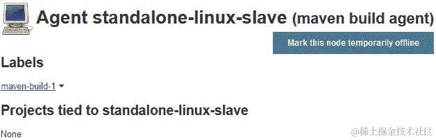 在 Jenkins 从属节点状态页面上,您将看到附加到相应 Jenkins 从属节点的标签,以及与以下 Jenkins 从属节点关联的项目的信息。请参阅以下屏幕截图: