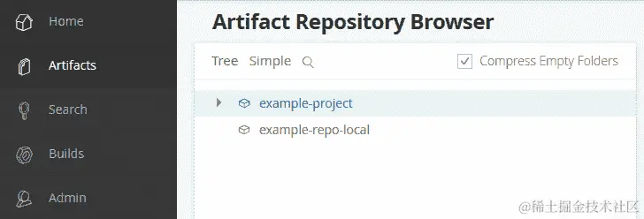 在左侧菜单中点击“Artifacts”选项卡。你应该在“Artifact Repository Browser”下看到你的仓库,如下截图所示: