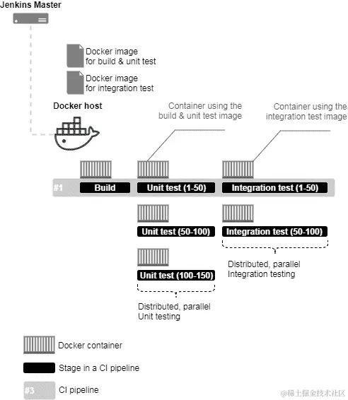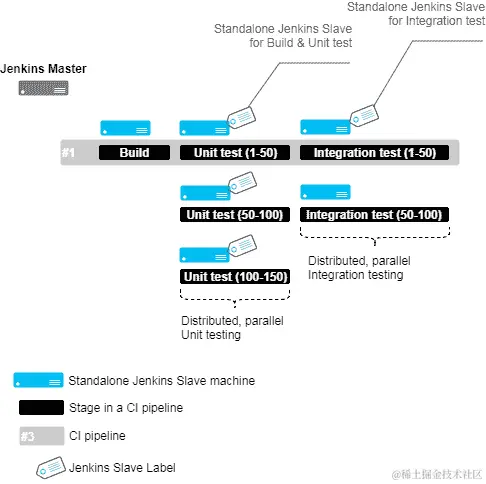 单元测试分布在三个用于构建和单元测试的 Jenkins 从节点代理中(第一类),而集成测试分布在两个用于集成测试的 Jenkins 从节点代理中(第二类)。