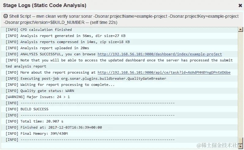 - 在名为“Stage Logs(静态代码分析)”的弹出窗口中向下滚动到底部。你应该看到一个链接,指向 SonarQube 分析页面。参见以下截图: