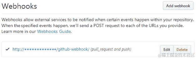 - 在存储库设置页面上,点击左侧菜单中的 Webhooks。您应该看到您的 Jenkins 服务器的 Webhooks,如下图所示: