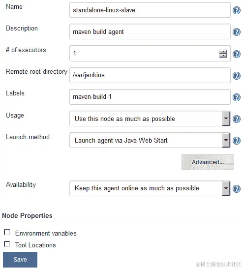 使用“描述”字段添加有关 Jenkins 从机的一些注释:例如,用途、类型、可构建或测试的内容以及已安装的工具。